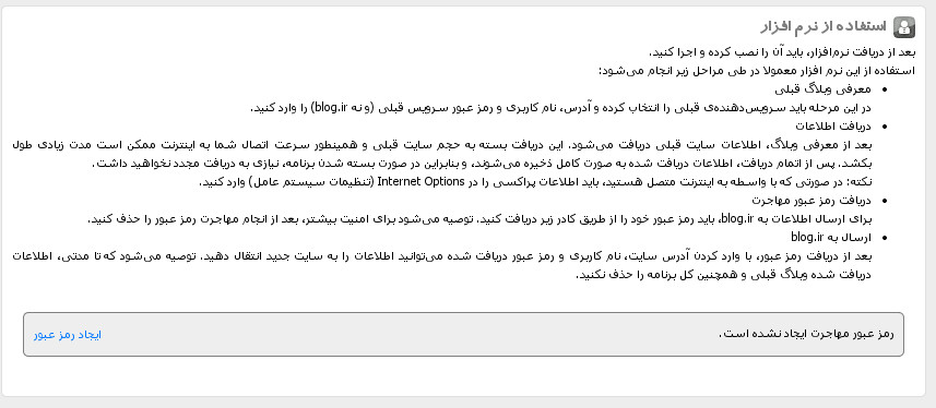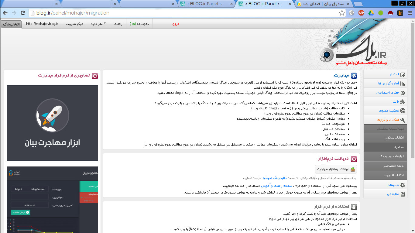 ابتدا از طریق سایت اصلی بیان bayan.ir در سرویس بلاگ بیان blog.ir عضو شوید و سپس از منوی مرکز مدیریت بلاگ ، گزینه «امکانات و ابزارها» را انتخاب نمایید، سپس بر روی «مهاجرت» کلیک نمایید.